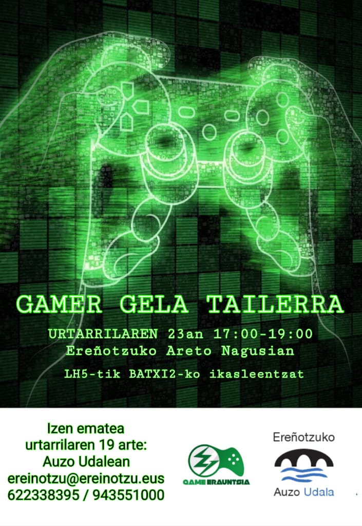 Game Erauntsia elkartearen eskutik, Gamer gela antolatu du Ereñotzuko auzo udalak 10-18 urte bitarteko ikasleei (LH5- Batxilergoa 2) zuzendua. Tailerraren helburua bideo-jokoen bidez euskara aisialdian erabiltzea, haien alderdi positiboak erakutsiz eta elkarbizitza sustatzea dira. Urtarrilaren 23an egingo da 17:00-19:00. Izen-ematea urtarrilaren 19 arte auzo udalean.